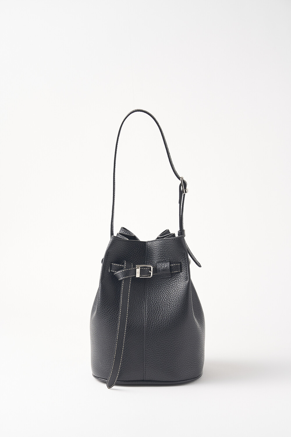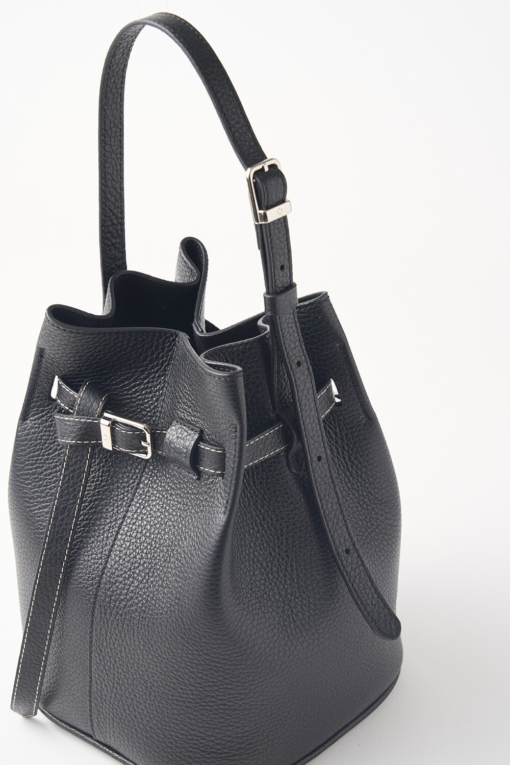 No need to fasten or unfasten the buckle to close or open the bag thanks to a button stud closure at the back, so you can cinch or expand the shape to give the bag flexible capacity. When closed, the bag creates naturally gathered folds on the side for elegant curves while it reveals the linear silhouette of its boxy design when wide open. Whether closed or open, this versatile bucket can be worn as a tote or carried over the shoulder with its adjustable shoulder strap.