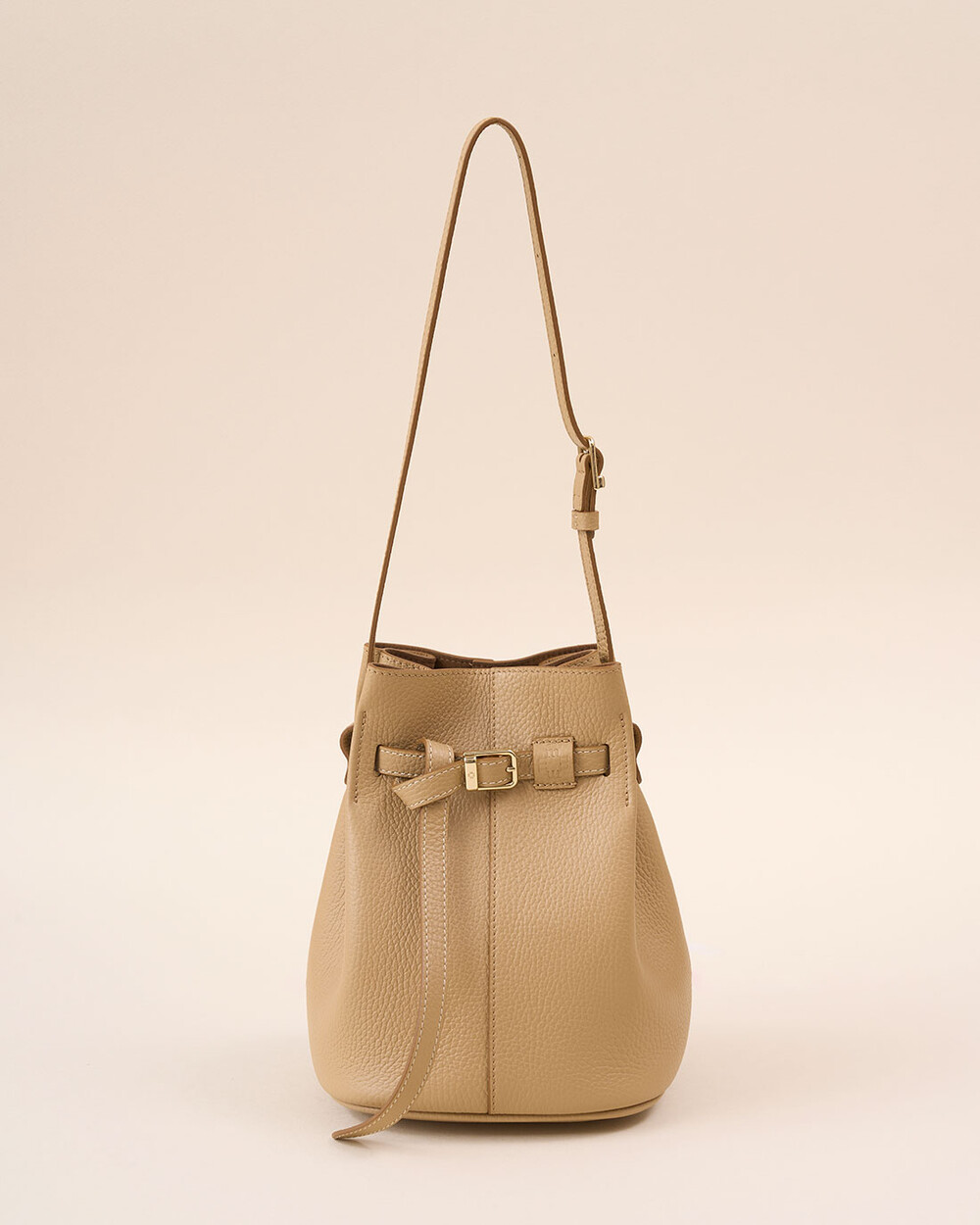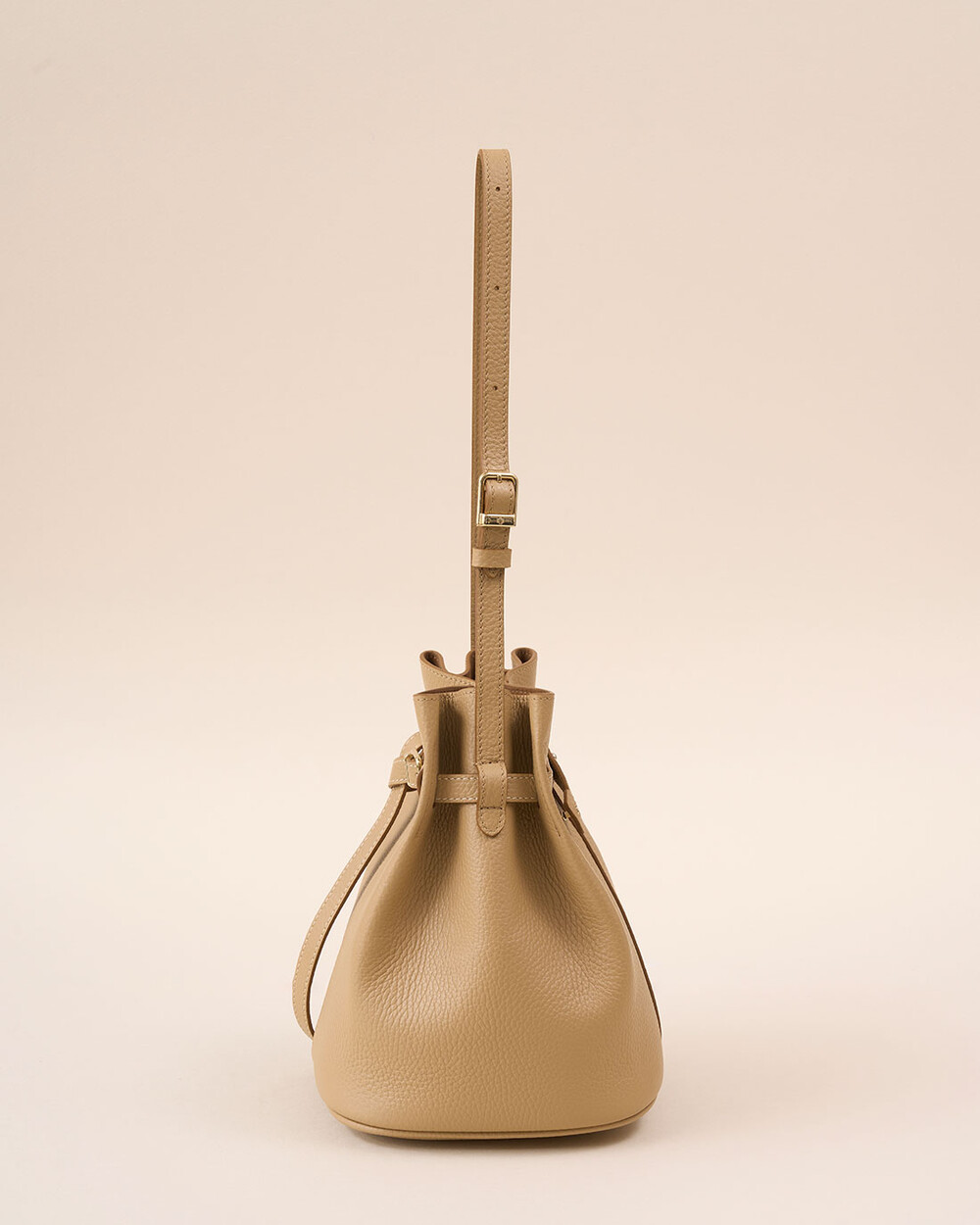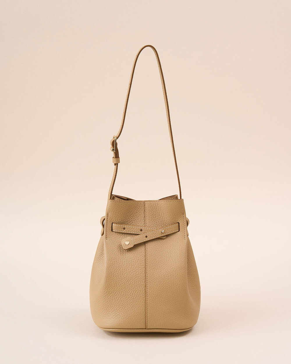 No need to fasten or unfasten the buckle to close or open the bag thanks to a button stud closure at the back, so you can cinch or expand the shape to give the bag flexible capacity. When closed, the bag creates naturally gathered folds on the side for elegant curves while it reveals the linear silhouette of its boxy design when wide open. Whether closed or open, this versatile bucket can be worn as a tote or carried over the shoulder with its adjustable shoulder strap.