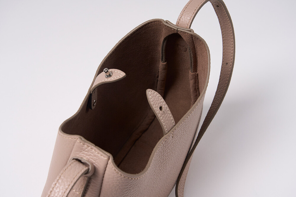 Fastening with a button stud closure at the top, it has an adjustable shoulder strap which offers multiple carrying options. Trimmed with tonal leather piping to fit the bag’s curves, this timeless design brings a twist to accentuate its contours with simply stitched corners around the top opening.